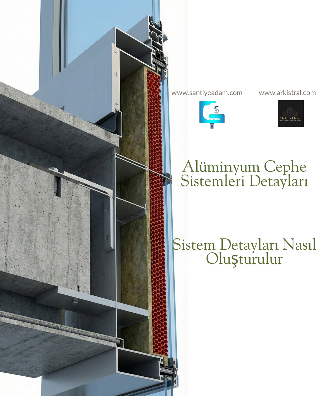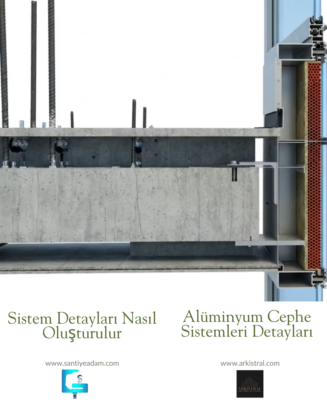 Bu yazıda, paylaşılan görselleri referans alarak alüminyum cephe sistem detaylarının adım adım nasıl oluşturulduğunu açıklıyoruz: hangi katman nerede başlamalı, yalıtım sürekliliği nasıl korunmalı, konsol/ankraj seçiminde hangi statik mantık izlenmeli, cam–profil birleşiminde hangi toleranslar bırakılmalı ve şantiyede en sık yapılan hatalar nasıl önlenmeli? Arkistral yaklaşımıyla hedefimiz, “güzel görünen” değil; çalışan, hesaplanan ve sahada sorunsuz uygulanabilen cephe detayları üretmek.